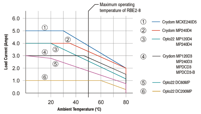 This figure shows the maximum allowable load current per relay vs. the ambient temperature. Note that the RBE2-8 itself is rated to 50°C.