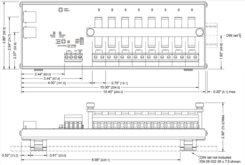 | Mounting | DIN rail or panel mount. The RBE2-8 ships in its DIN rail mount configuration. Mounting style can be changed in the field. DIN channel can be EN 05 022 or EN 05 035. |